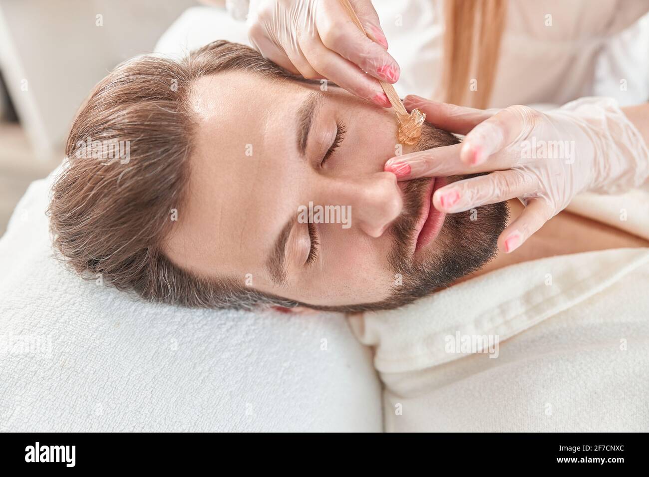 Concept Of Cosmetology And Facial A Woman Beautician Makes Face And Beard Modeling For A Man Waxing Epilation Depilation With Wax Stock Photo Alamy